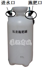 施肥阀与施肥罐是共同使用的,施肥罐上的两根软管分别于施肥阀上的两个铜阀门连接,安装时需要先拧开施肥罐顶端的盖子,观察两根软管插入罐体内的深度,插入较深的一根软管连接施肥阀上进水一端的铜阀门,插入较短的一根连接出水端阀门。