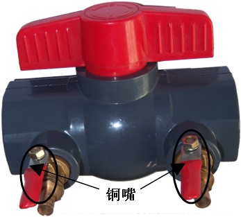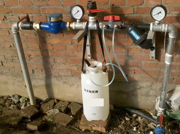 施肥阀与施肥罐是共同使用的,施肥罐上的两根软管分别于施肥阀上的两个铜阀门连接,安装时需要先拧开施肥罐顶端的盖子,观察两根软管插入罐体内的深度,插入较深的一根软管连接施肥阀上进水一端的铜阀门,插入较短的一根连接出水端阀门。
